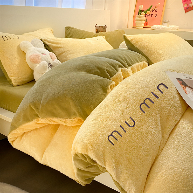 冬季加厚保暖A类母婴级北极绒拼牛奶绒四件套纯色刺绣床上三件套