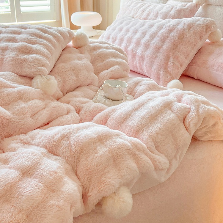 少女心毛球纯色兔兔绒保暖牛奶绒加厚四件套2024新款珊瑚