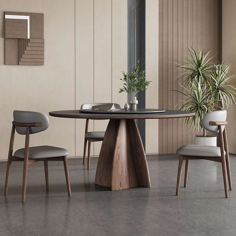 实木餐桌圆形带转盘家用新款胡桃木色侘寂风现代简约哑光岩板圆桌